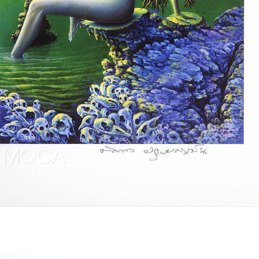 The artwork “อาบจันทร์” by Sompong Adulyasaraphan portrays an escape from the old world into a realm of new hope. Guided by imagination, the artist journeys into a dreamlike world—an otherworldly land full of color and vitality. A beautiful female figure with the face of an owl symbolizes the unity of all beings. Whether human or animal, all are born to adorn the world and eventually fade away in time.