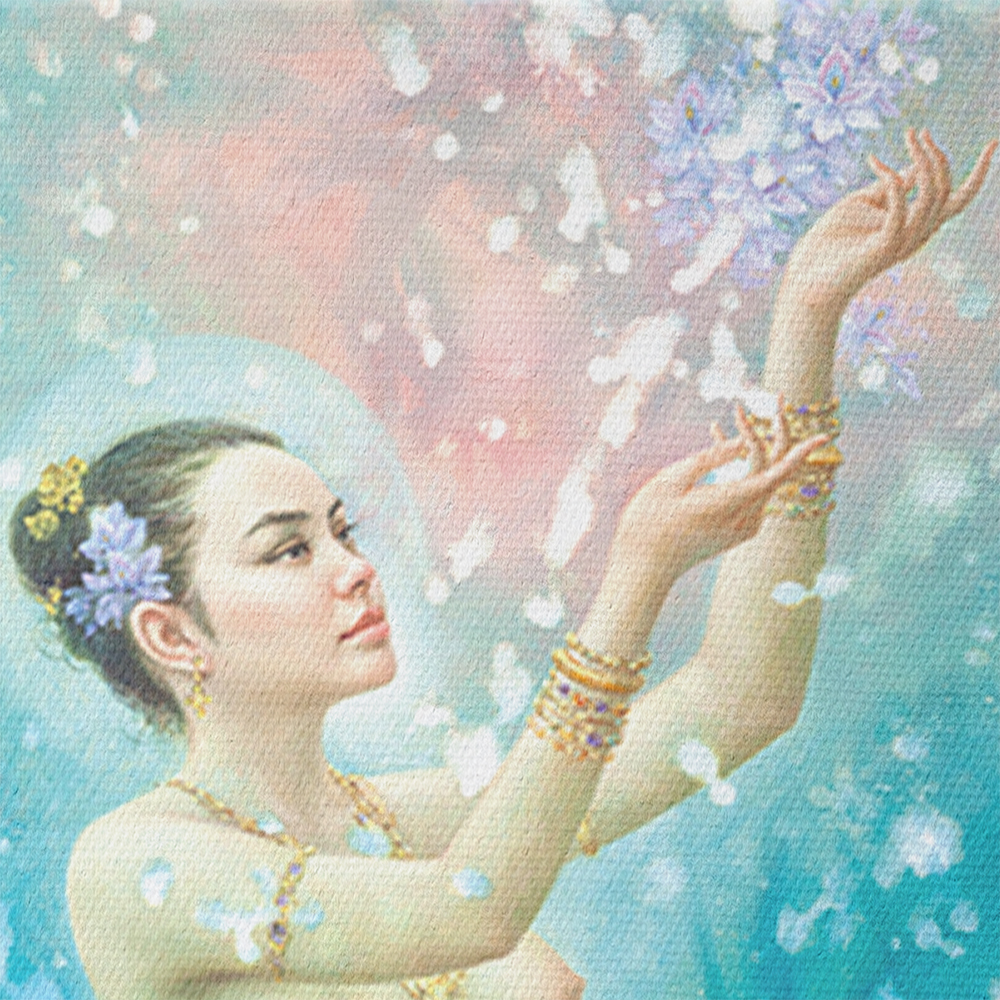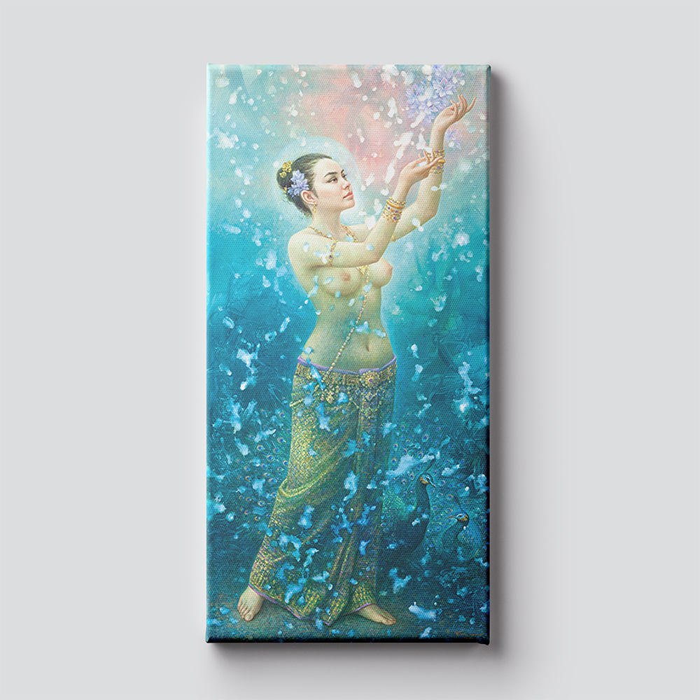 “…This Songkran goddess painting series is inspired by cultural art traditions. It transforms beliefs and understandings into modern artworks that people can easily access. The depiction of deities and celestial beings is rendered in a realistic style. Prince Narisara Nuwattiwong has influenced my work. The costumes highlight the human form beautifully and are not intended to be indecent in any way…” Sompop Budtard
